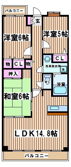 間取りは3LDKで、LDK14.8帖、洋室5帖、洋室6帖、和室6.5畳となっております。